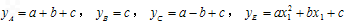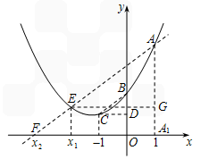 | 解:(Ⅰ)若a=1,b=4,c=10, 此時(shí)拋物線的解析式為y=x2+4x+10, ① ∵ ∴ 拋物線的頂點(diǎn)坐標(biāo)為P(-2,6); ②∵點(diǎn) ∴ ∴ (Ⅱ)由0<2a<b,得 由題意,如圖,過點(diǎn)A作AA1⊥x軸于點(diǎn)A1,則AA1=yA,OA1=1, 連接BC,過點(diǎn)C作CD⊥y軸于點(diǎn)D,則BD=yB-yC,CD=1, 過點(diǎn)A作AF∥BC,交拋物線于點(diǎn)E(x1,ye),交x軸于點(diǎn) 于是 過點(diǎn)E作 有 ∵ 點(diǎn) 得 ∴ 化簡(jiǎn),得 ∵ ∴ |