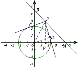 | ②過P作x軸的垂線,垂足為F,連結(jié)OD ∵PC、PD是⊙O的兩條切線,∠CPD=90°, ∴∠OPD=∠OPC= ∵∠PDO=90°,∠POD=∠OPD=45°, ∴OD=PD= ∵P在直線y=-x+4上,設(shè)P(m,-m+4),則OF=m,PF=-m+4, ∵∠PFO=90°,OF2+PF2=PO2, ∴m2+ (-m+4)2=( 解得m=1或3, ∴P的坐標(biāo)為(1,3)或(3,1)。 |