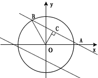 | (2) 分兩種情形, 直線 如圖,畫出弦心距OC,可得弦心距OC= 又∵直線 ∴直線與x軸交角的正切值為 ∴AC= 所以直線與y軸交于點(diǎn)( 當(dāng)直線與x軸、y軸的負(fù)半軸相交,同理可求得b的值為- 綜合以上得:b的值為 |