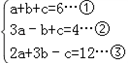 解:①﹣②得:2b﹣2a=2,即b﹣a=1,①+③得:3a+4b=18,解解得:把a(bǔ)=2,b=3代入方程①得:2+3+c=6解得:c=1.則方程組的解是: