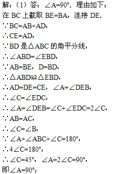 (1)若BC=AB+AD,請你猜想∠A的度數(shù),并證明;