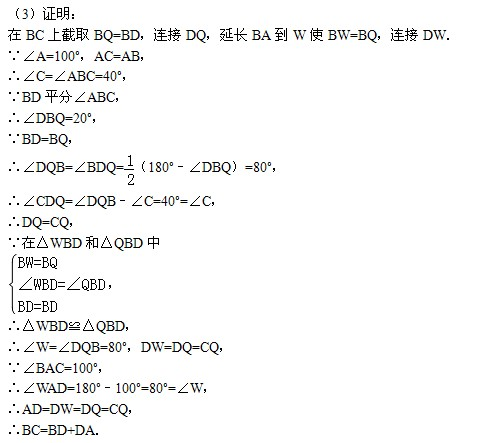 (3)若∠A=100°,求證:BC=BD+DA.