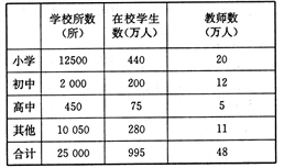 全省共有各級各類學(xué)校25000所,其中小學(xué)12500所,初中2000所,高中450所,其它學(xué)校10050所;全省共有在校學(xué)生995萬人,其中小學(xué)440萬人,初中200萬人,高中75萬人,其它280萬人;全省共有在職教師48萬人,其中小學(xué)20萬人,初中12萬人,高中5萬人,其它11萬人.