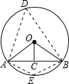 分析:分兩種情況考慮:D在優(yōu)弧ADB上或E在劣弧AB上時,可得弦AB所對的圓周角為∠D或∠E;根據(jù)題意畫出相應的圖形,作OC垂直于AB,利用垂徑定理得到C為AB的中點,由AB的長求出AC的長,再由直徑的長求出AO的長,利用銳角三角函數(shù)定義及特殊角的三角函數(shù)值求出∠OAC的度數(shù),由OA=OB,利用等邊對等角得到∠OAC=∠OBC,利用內(nèi)角和定理求出圓心角∠AOB的度數(shù),利用圓周角定理求出∠D的度數(shù),再根據(jù)圓內(nèi)接四邊形的對角互補即可求出∠E的度數(shù),確定出AB所對圓周角的度數(shù).