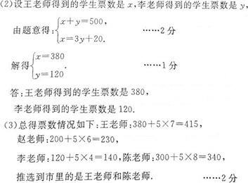 (2)王老師與李老師得到的學(xué)生總票數(shù)都是500,且王老師得到的學(xué)生票數(shù)是李老師得到的學(xué)生票數(shù)的3倍多20票,求王老師與李老師得到的學(xué)生票分別是多少?
