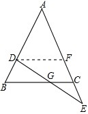 | 解:過(guò)點(diǎn)D作DF∥BC交AC于點(diǎn)F ∴ ∵△ABC中,AB=AC, ∴BD=CF, ∵BD=CE, ∴CE=CF, ∵在△EFD中,GC∥DF, ∴CE:CF=GE:GD, ∴DG=EG |