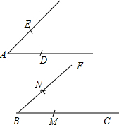 分析:首先作射線BC;再以A為圓心,任意長(zhǎng)為半徑作弧,以B為圓心,以同樣長(zhǎng)為半徑,作弧,再以DE長(zhǎng)為半徑,M為圓心畫弧即可得出N位置,進(jìn)而得出答案.