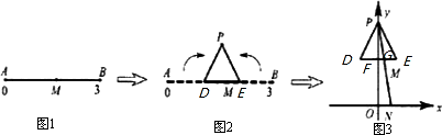 李老師從“淋浴龍頭”受到啟發(fā).編了一個(gè)題目:在數(shù)軸上截取從0到3的對(duì)應(yīng)線段AB,實(shí)數(shù)m對(duì)應(yīng)AB上的點(diǎn)M,如圖1;將AB折成正三角形,使點(diǎn)A,B重合于點(diǎn)P,如圖2;建立平面直角坐標(biāo)系,平移此三角形,使它關(guān)于y軸對(duì)稱,且點(diǎn)P的坐標(biāo)為(0,2),PM與x軸交于點(diǎn)N(n,0),如圖3.當(dāng)m=