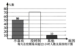 國(guó)家教育部規(guī)定“中小學(xué)生每天在校體育活動(dòng)時(shí)間不低于1小時(shí)”.西寧市某中學(xué)為了了解學(xué)生體育活動(dòng)情況,隨機(jī)抽查了520名畢業(yè)班學(xué)生,調(diào)查內(nèi)容是:“每天鍛煉是否超過(guò)1小時(shí)及未超過(guò)1小時(shí)的原因“.以下是根據(jù)所得的數(shù)據(jù)制成的統(tǒng)計(jì)圖的一部分.