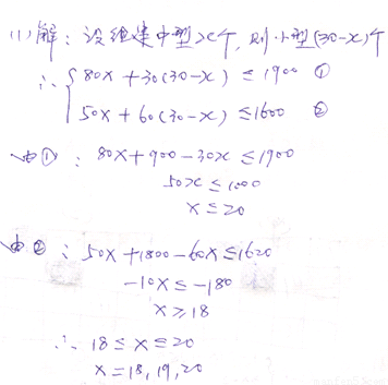 (2011山東棗莊,22,8分)某中學(xué)為落實市教育局提出的“全員育人,創(chuàng)辦特色學(xué)!钡臅h精神,決心打造“書香校園”,計劃用不超過1900本科技類書籍和1620本人文類書籍,組建中、小型兩類圖書角共30個.已知組建一個中型圖書角需科技類書籍80本,人文類書籍50本;組建一個小型圖書角需科技類書籍30本,人文類書籍60本.