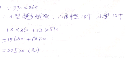 (2)若組建一個中型圖書角的費(fèi)用是860元,組建一個小型圖書角的費(fèi)用是570元,試說明(1)中哪種方案費(fèi)用最低,最低費(fèi)用是多少元?