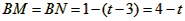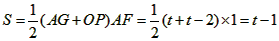 | (2)分三種情況: ①當(dāng)0<t≤2,重疊部分的面積是S△OPQ, 過點(diǎn)A作AF⊥x軸于點(diǎn)F, ∵A(1,1), ∴在Rt△OAF中,AF=OF=1,∠AOF=45°,在Rt△OPQ中,OP=t,∠OPQ=∠QOP=45°, ∴PQ=OQ=tcos 45°= ∴ ②當(dāng)2<t≤3,設(shè)PQ交AB于點(diǎn)G,作GH⊥x軸于點(diǎn)H,∠OPQ=∠QOP=45°, 則四邊形OAGP是等腰梯形,重疊部分的面積是S梯形OAGP, ∴AG=FH=t-2, ∴ ③當(dāng)3<t<4,設(shè)PQ與AB交于點(diǎn)M,交BC于點(diǎn)N,重疊部分的面積是S五邊形OAMNC, 因?yàn)椤鱌NC和△BMN都是等腰直角三角形, 所以重疊部分的面積是S五邊形OAMNC=S梯形OABC-S△BMN, ∵B(3,1),OP=t, ∴PC=CN=t-3, ∴ ∴ |