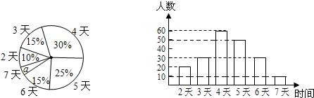 分析:(1)首先根據(jù)2天人數(shù)和所占百分比求出總?cè)藬?shù),即可根據(jù)圖中獲取信息求出7天的人數(shù),并補(bǔ)全條形統(tǒng)計(jì)圖;