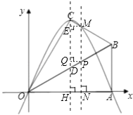 | 解:(1)過點(diǎn)C作CH⊥x軸,垂足為H, ∵在Rt△OAB中,∠OAB=90°,∠BOA=30°,AB=2, ∴OB=4,OA=2 由折疊的性質(zhì)知:∠COB=30°,OC=AO=2 ∴∠COH=60°,OH= ∴C點(diǎn)坐標(biāo)為( (2)∵拋物線y=ax2+bx(a≠0)經(jīng)過C( A(2 ∴ ∴此拋物線的函數(shù)關(guān)系式為:y=﹣x2+2 (3)存在. 因?yàn)閥=﹣x2+2 MP⊥x軸,垂足為N,設(shè)PN=t; ∵∠BOA=30°, ∴ON= ∴P( 作PQ⊥CD,垂足為Q,ME⊥CD,垂足為E, 把x= ∴M( 同理:Q( 要使四邊形CDPM為等腰梯形,只需CE=QD, 即3﹣(﹣3t2+6t)=t﹣1,解得:t= ∴P點(diǎn)坐標(biāo)為( ∴存在滿足條件的P點(diǎn),使得四邊形CDPM為等腰梯形, 此時(shí)P點(diǎn)坐標(biāo)為( |