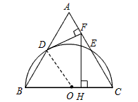 | 解:(1)DF與⊙O相切, 如圖,連結(jié)OD, 因?yàn)?IMG style="VERTICAL-ALIGN: middle" border=0 src="http://thumb.zyjl.cn/pic1/upload/papers/c02/20120229/201202292358560161038.gif">是等邊三角形, 所以 因?yàn)?IMG style="VERTICAL-ALIGN: middle" border=0 src="http://thumb.zyjl.cn/pic1/upload/papers/c02/20120229/201202292358564991380.gif">, 所以 所以 所以DF是⊙O的切線; (2)因?yàn)?IMG style="VERTICAL-ALIGN: middle" border=0 src="http://thumb.zyjl.cn/pic1/upload/papers/c02/20120229/201202292358569951408.gif">, 所以 所以 因?yàn)?IMG style="VERTICAL-ALIGN: middle" border=0 src="http://thumb.zyjl.cn/pic1/upload/papers/c02/20120229/201202292358574711081.gif">, 所以 在 所以 即FH的長(zhǎng)為 |