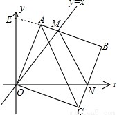 在平面直角坐標(biāo)系中,邊長為2的正方形OABC的兩頂點A、C分別在y軸、x軸的正半軸上,點O在原點.現(xiàn)將正方形OABC繞O點順時針旋轉(zhuǎn),當(dāng)A點第一次落在直線y=x上時停止旋轉(zhuǎn),旋轉(zhuǎn)過程中,AB邊交直線y=x于點M,BC邊交x軸于點N(如圖).