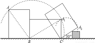 如圖,王虎使一長(zhǎng)為4cm,寬為3cm的長(zhǎng)方形木板,在桌面上做無(wú)滑動(dòng)的翻滾(順時(shí)針?lè)较颍┠景迳宵c(diǎn)A位置變化為A→A1→A2,其中第二次翻滾被桌面上一小木塊擋住,使木板與桌面成30°角,則點(diǎn)A翻滾到A2位置時(shí)共走過(guò)的路徑長(zhǎng)為多少?