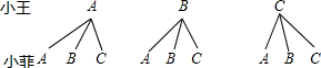 .學(xué)校安排三輛車(chē),組織九年級(jí)學(xué)生團(tuán)員去敬老院慰問(wèn)老人,其中小王與小菲都可以從這三輛車(chē)中任選一輛搭乘,則小王與小菲同車(chē)的概率為_(kāi)_________.