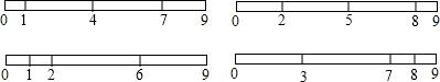 有一把長為9cm的直尺,請在直尺上確定三條刻度線的位置,使得用這把只有三條刻度線的直尺可以量出從1~9cm的所有整厘米長的線段.請你在下列所示的直尺上,至少設計出三種方案.