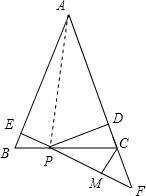 解答:解:如圖所示,△DCP沿PC邊翻轉(zhuǎn),PM的延長(zhǎng)線交AC的延長(zhǎng)線于F點(diǎn),則PM=PD,