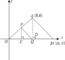 在△OAB中,O為坐標(biāo)原點(diǎn),橫、縱軸的單位長(zhǎng)度相同,A、B的坐標(biāo)分別為(8,6),(16,0),點(diǎn)P沿OA邊從點(diǎn)O開始向終點(diǎn)A運(yùn)動(dòng),速度每秒1個(gè)單位,點(diǎn)Q沿BO邊從B點(diǎn)開始向終點(diǎn)O運(yùn)動(dòng),速度每秒2個(gè)單位,如果P、Q同時(shí)出發(fā),用t(秒)表示移動(dòng)時(shí)間,當(dāng)這兩點(diǎn)中有一點(diǎn)到達(dá)自己的終點(diǎn)時(shí),另一點(diǎn)也停止運(yùn)動(dòng).