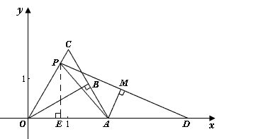 | 解:(1)由題意可知 OA=OC, ∵∠OBA=90°,OB= ∴sin∠OAB= ∴∠OAB=60°, ∴△OAC為等邊三角形; (2)由(1)可知OC=OA=2,∠COA=60°, ∵PC=x, ∴OP=2-x 過點(diǎn)P作PE⊥OA于點(diǎn)E,在Rt△POE中,sin∠POE= ∴ ∴ ∴ (3)當(dāng)x= ∴OP= 在Rt△POE中,PE=OP·sin ∠POE= OE=OP·cos∠POE= ∴DE=OD-OE= ∴在Rt△PDE中,PD= 又∵S△PAD= ∴S△PAD= ∴AM= ∴k= ∴ ∴ ∵此二次函數(shù)圖象的對稱軸是直線x=0, ∴此二次函數(shù)的圖象關(guān)于y軸對稱。 |