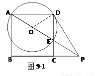 如圖9-1,已知ABCD是邊長為4的正方形,E是CD邊上的一個動點,連接AE,AE的延長線交BC的延長線于點P,連接PD.作△ADE的外接圓⊙O.設(shè)DE = x,PC = y.