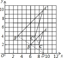 分析:首先連接B′B并延長交于C′C的延長線于點(diǎn)D,則點(diǎn)D即為位似中心,則可求得位似中心的坐標(biāo);又由△ABC與△A′B′C′的相似比即是其對應(yīng)邊的比,則可求得答案.
