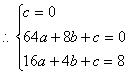| 如圖,直角梯形OABC中,O為坐標原點,OA=OC,點C的坐標是(0,8),以點B為頂點的拋物線y=ax2+bx+c經(jīng)過原點和x軸上的點A。求拋物線的解析式。 |