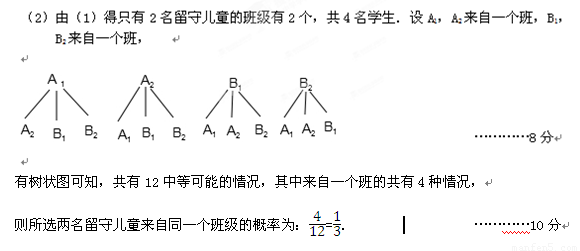 (2)某愛(ài)心人士決定從只有2名留守兒童的這些班級(jí)中,任選兩名進(jìn)行生活資助,請(qǐng)用列表法或樹(shù)狀圖的方法,求出所選兩名留守兒童來(lái)自同一個(gè)班級(jí)的概率. (4分)
