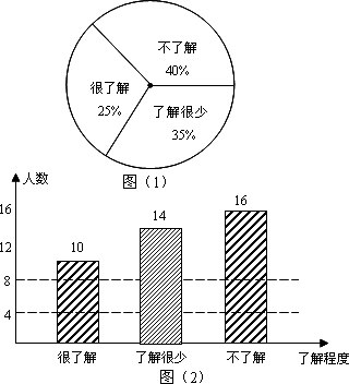 在今年法國網(wǎng)球公開賽中,我國選手李娜在決賽中成功擊敗對手奪冠,稱為獲得法國網(wǎng)球公開賽冠軍的亞洲第一人.某班體育委員就本班同學對該屆法國網(wǎng)球公開賽的了解程度進行全面調(diào)查統(tǒng)計,收集數(shù)據(jù)后繪制了兩幅不完整的統(tǒng)計圖,如圖(1)和圖(2).根據(jù)圖中的信息,解答下列問題: