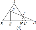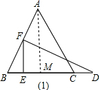 解:(1)當(dāng)F在邊AB上時(shí),如圖(1),作AM⊥BC,則AM=