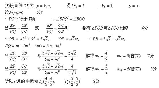 (3) 過O,B兩點(diǎn)作直線,如果P是直線OB上的一個(gè)動(dòng)點(diǎn),過點(diǎn)P作直線PQ平行于y軸,交拋物線于點(diǎn)Q。問:是否存在點(diǎn)P,使得以P,Q,B為頂點(diǎn)的三角形與△OBC相似?如果存在,請(qǐng)求出點(diǎn)P的坐標(biāo);如果不存在,請(qǐng)說明理由。