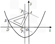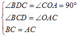 | 解:(1)∵ ∠BCD+∠ACO=90°,∠ACO+∠OAC=90°, ∴∠BCD=∠OAC ∵△ABC為等腰直角三角形, ∴BC=AC 在△BDC和△COA中, ∴△BDC≌△COA(AAS); (2)∵C點(diǎn)坐標(biāo)為(-1,0), ∴BD=CO=1, ∵B點(diǎn)的橫坐標(biāo)為-3, ∴B點(diǎn)坐標(biāo)為(-3,1) 設(shè)BC所在直線(xiàn)的函數(shù)關(guān)系式為y=kx+b, 則有 解之,得 ∴BC所在直線(xiàn)的函數(shù)關(guān)系式為 (3)存在.二次函數(shù)解析式為 ∴對(duì)稱(chēng)軸為直線(xiàn) 若以AC為直角邊,點(diǎn)C為直角頂點(diǎn),對(duì)稱(chēng)軸上有一點(diǎn)P1,使CP1⊥AC ∵BC⊥AC ∴點(diǎn)P1為直線(xiàn)BC與對(duì)稱(chēng)軸直線(xiàn) 由題意,得 解之,得 ∴ 若以AC為直角邊,點(diǎn)A為直角頂點(diǎn),對(duì)稱(chēng)軸上有一點(diǎn)P2,使AP2⊥AC,過(guò)點(diǎn)A作AP2⊥BC,交對(duì)稱(chēng)軸直線(xiàn) ∵CD=OA, ∴A(0,2), 易求得直線(xiàn)AP2的解析式為 由 ∴ ∴滿(mǎn)足條件的點(diǎn)有兩個(gè),坐標(biāo)分別為 |