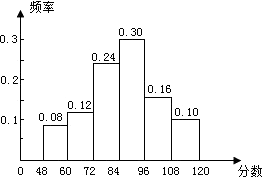 | 分?jǐn)?shù)段 | 48-60 | 60-72 | 72-84 | 84-96 | 96-108 | 108-120 | 合計 |