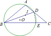 如圖,△ABC中,AB=AC,∠A=100°,I是內心,BI的延長線交AC于點D,過A、B、D三點作⊙O交BC于E點.