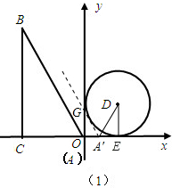| 如圖(1),在平面直角坐標系中,Rt△ABC的AC邊與x軸重合,且點A在原點, ∠ACB=90°,∠BAC=60°AC=2,;又一直徑為2的⊙D與x軸切于點E(1,0); (1)若Rt△ABC沿x軸正方向移動,當斜邊AB與⊙O相切時,試寫出此時點A的坐標; (2)當Rt△ABC的邊BC移動到與y軸重合時,則把Rt△ACB繞原點O按逆時針方向旋轉(zhuǎn),使斜邊AB恰好經(jīng)過點F(0,2),得Rt△A'B'O,AB分別與A'O、A'B'相交于M、N, 如圖(2)所示。 ① 求旋轉(zhuǎn)角∠AOA′的度數(shù)。 ② 求四邊形FOMN的面積。(結(jié)果保留根號) |