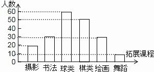 2010年5月18日“全國(guó)首屆農(nóng)村地區(qū)基礎(chǔ)教育課程改革研討會(huì)”在綦江召開(kāi),我縣的“2+x”拓展課程受到專(zhuān)家的高度評(píng)價(jià).在100多項(xiàng)“2+x”拓展課程中,教育行政主管部門(mén)對(duì)其中若干學(xué)生參加球類(lèi)、棋類(lèi)、繪畫(huà)、書(shū)法、攝影、舞蹈活動(dòng)的人數(shù)比例情況進(jìn)行調(diào)查,所得的部分?jǐn)?shù)據(jù)繪制了下面兩幅不完整的統(tǒng)計(jì)圖(如圖).