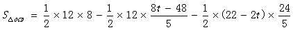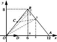 | (2)當(dāng)D在OA上運(yùn)動時(shí), 當(dāng)D在AB上運(yùn)動時(shí),過點(diǎn)O作OE⊥AB,過點(diǎn)C作CF⊥AB,垂足分別為E和F, 過D作DM⊥OA,過B作BN⊥OA,垂足分別為M和N,如圖, 設(shè)D點(diǎn)運(yùn)動的時(shí)間為t秒, 所以DA=2t-12,BD=22-2t, 又因?yàn)镃為OB的中點(diǎn), 所以BF為△BOE的中位線 所以 又因?yàn)?IMG style="VERTICAL-ALIGN: middle" border=0 src="http://thumb.zyjl.cn/pic1/upload/papers/c02/20120204/201202041444526101169.gif"> 所以 所以 因?yàn)锽N⊥OA,DM⊥OA, 所以△ADM∽△ABN 所以 所以 又因?yàn)?IMG style="VERTICAL-ALIGN: middle" border=0 src="http://thumb.zyjl.cn/pic1/upload/papers/c02/20120204/201202041444526391131.gif"> 所以 即 所以當(dāng)t=6時(shí),△OCD面積最大,為 當(dāng)D在OB上運(yùn)動時(shí),O、C、D在同一直線上,S=0(11≤t≤16)。 |