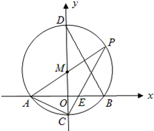 如圖,在平面直角坐標(biāo)系中,以點(diǎn)M(0,)為圓心,作⊙M交x軸于A、B兩點(diǎn),交y軸于C、D兩點(diǎn),連接AM并延長(zhǎng)交⊙M于點(diǎn)P,連接PC交x軸于點(diǎn)E,連接DB,∠BDC=30°.