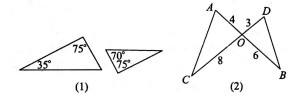 已知如圖(1) 、(2) 中各有兩個三角形,其邊長和角的度數(shù)已在圖上標注,圖(2) 中AB 、CD 交于O 點,對于各圖中的兩個三角形而言,下列說法正確的是