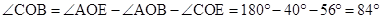 如圖,點A、O、E在同一直線上,∠AOB=40°,∠DOE=28°,OD平分∠COE, 求∠BOC的度數(shù)。(5分)![]()