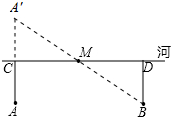 分析:根據(jù)軸對(duì)稱的性質(zhì)和“兩點(diǎn)之間線段最短”,連接A′B,得到最短距離為A′B,再根據(jù)相似三角形的性質(zhì)和A到河岸CD的中點(diǎn)的距離為500米,即可求出A'B的值.