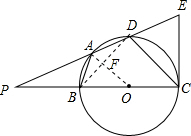 分析:連接OA、BD,OA與BD交于F點(diǎn),根據(jù)垂徑定理由AB=AD得到OA⊥BD,BF=DF,則OF=DC=9,根據(jù)圓周角定理的推論由BC為⊙O的直徑得到∠BDC=90°,則OA∥DC,得到△PAO∽△PDC,根據(jù)相似比可得到得OA=12,PA=PD,即PD=3AD,再根據(jù)勾股定理計(jì)算出BF=3,AB=6,則PD=18,然后根據(jù)切線的性質(zhì)和切割線定理得到CE⊥PC,EC2=DE•EA,再利用勾股定理得EC2=PE2-PC2,于是得到關(guān)于DE的方程DE(DE+6)=(18+DE)2-362,然后解方程即可.