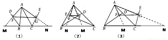 如圖(1),BD、CE分別是△ABC的外角平分線,過(guò)點(diǎn)A作AF⊥BD,AG⊥CE,垂足分別為F、G,連結(jié)FG,延長(zhǎng)AF、AG,與直線BC相交于M、N。