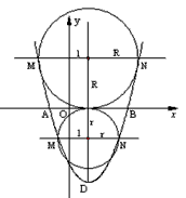 | (3)如圖,①當(dāng)直線MN在x軸上方時(shí), 設(shè)圓的半徑為R(R>0),則N(R+1,R), 代入拋物線的表達(dá)式,解得 ②當(dāng)直線MN在x軸下方時(shí), 設(shè)圓的半徑為r(r>0),則N(r+1,-r), 代入拋物線的表達(dá)式,解得 所以,圓的半徑為 |