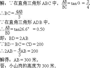 ,在與山腳C距離200米的D處,測(cè)得山頂A的仰角為26.6°,求小山崗的高AB(結(jié)果取整數(shù):參考數(shù)據(jù):sin26.6°=0.45,cos26.6°=0.89,tan26.6°=0.50).