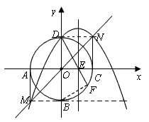 | (2)設(shè)拋物線的解析式為 ∵點(diǎn)D、M、N在拋物線上, ∴得: 解之,得: ∴拋物線的解析式為: ∵ ∴ 拋物線的對(duì)稱(chēng)軸為 ∴ 連結(jié) ∴ ∴ 又 ∴ ∴ 在直角三角形DOE中, cos∠BDF= |
