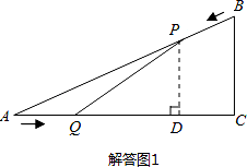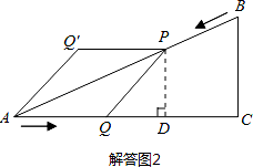 | 解:∵AB=10cm,AC=8cm,BC=6cm, ∴由勾股定理逆定理得△ABC為直角三角形,∠C為直角. (1)BP=2t,則AP=10﹣2t. ∵PQ∥BC, ∴ ∵當(dāng)t= (2)如答圖1所示,過P點作PD⊥AC于點D. ∴PD∥BC,∴ S= ∴當(dāng)t= (3)假設(shè)存在某時刻t,使線段PQ恰好把△ABC的面積平分, 則有S△AQP= 由(2)可知,S△AQP=﹣ ∴﹣ ∵△=(﹣5)2﹣4×1×10=﹣15<0,此方程無解, ∴不存在某時刻t,使線段PQ恰好把△ABC的面積平分. (4)假設(shè)存在時刻t,使四邊形AQPQ′為菱形,則有AQ=PQ=BP=2t. 如答圖2所示,過P點作PD⊥AC于點D,則有PD∥BC, ∴ 解得:PD=6﹣ ∴QD=AD﹣AQ=8﹣ 在Rt△PQD中,由勾股定理得:QD2+PD2=PQ2, 即(8﹣ 化簡得:13t2﹣90t+125=0, 解得:t1=5,t2= ∵t=5s時,AQ=10cm>AC,不符合題意,舍去,∴t= 由(2)可知,S△AQP=﹣ ∴S菱形AQPQ′=2S△AQP=2×(﹣ 所以存在時刻t,使四邊形AQPQ′為菱形,此時菱形的面積為 |