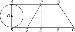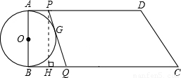 (2)因?yàn)辄c(diǎn)P、Q分別在線段AD和BC上的運(yùn)動(dòng),可以統(tǒng)一到直線PQ的運(yùn)動(dòng)中,要探求時(shí)間t對(duì)直線PQ與⊙O位置關(guān)系的影響,可先求出t為何值時(shí),直線PQ與⊙O相切這一整個(gè)運(yùn)動(dòng)過程中的一瞬,再結(jié)合PQ的初始與終了位置一起加以考慮,設(shè)運(yùn)動(dòng)t秒時(shí),直線PQ與⊙O相切于點(diǎn)G,如圖因?yàn),AB=8,AP=t,BQ=26-3t,所以,PQ=26-2t,因而,過p做PH⊥BC,得HQ=26-4t,于是由勾股定理,可的關(guān)于t的一元二次方程,則t可求.問題得解.